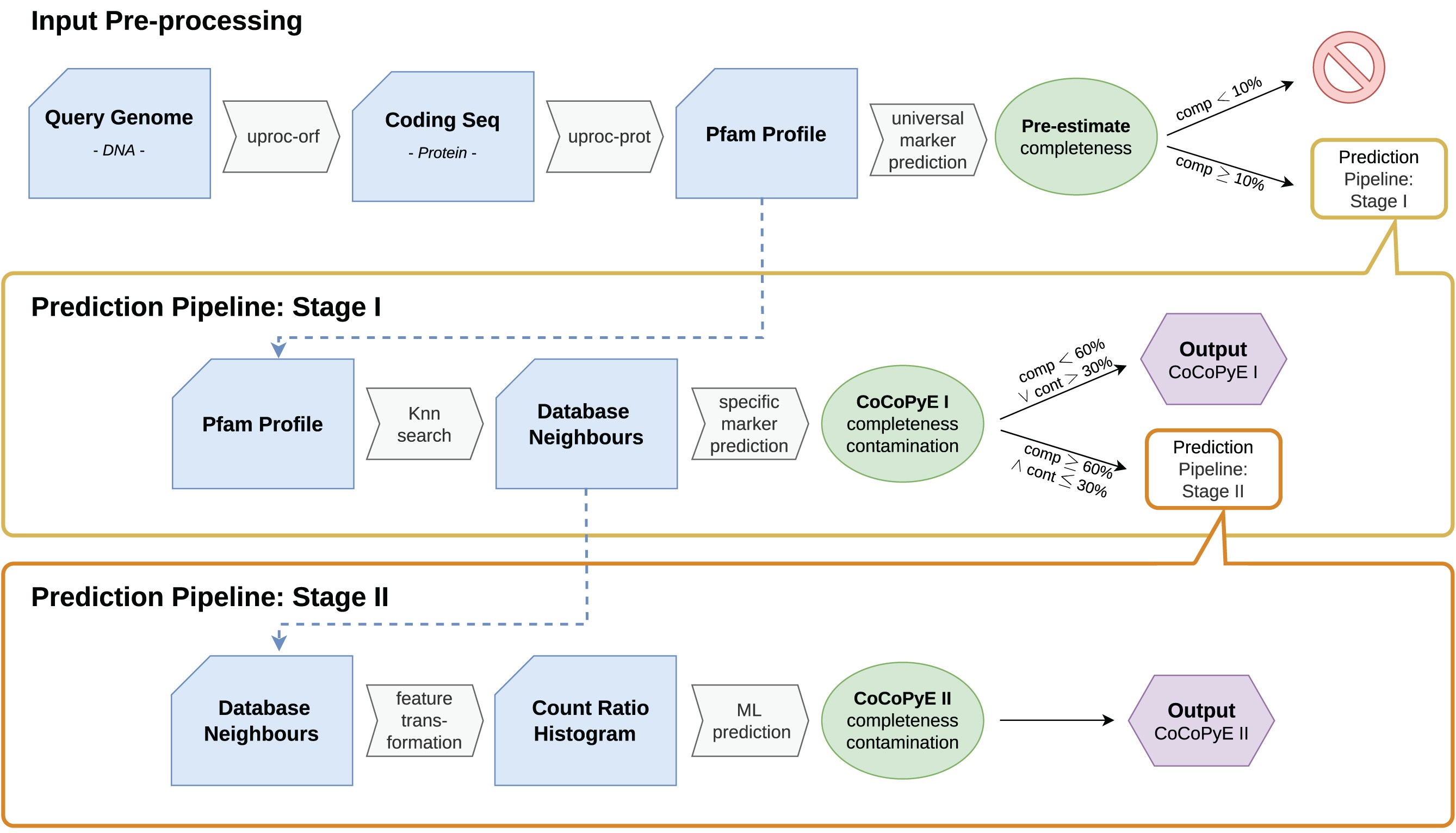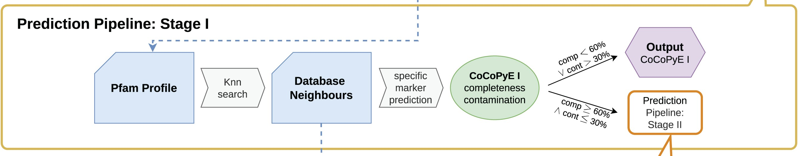 Next a specific marker prediction is carried out to create the stage I (i.e. marker based) completeness & contamination values. The Pfam database has information on which taxa these domains are present in. Therefore, sets of domains can be used as markers for specific lineages.