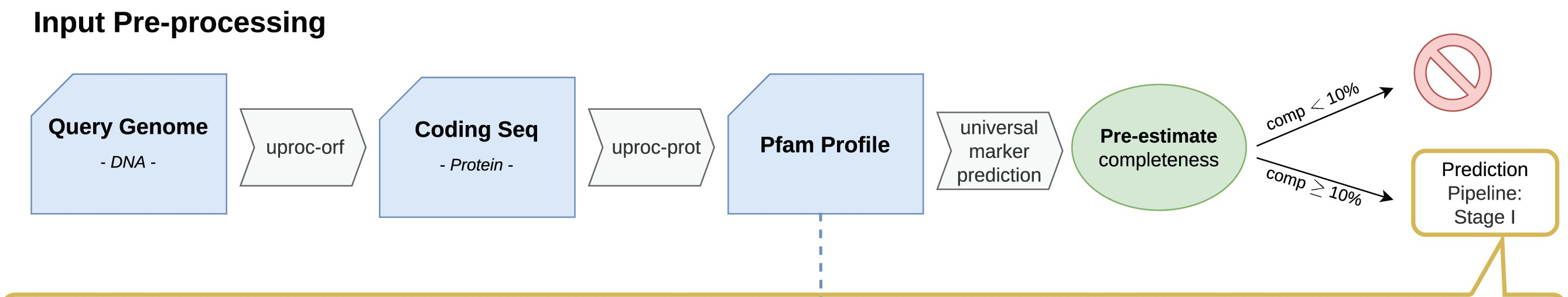 The completeness of the query genome is estimated based on one of 2 universal marker sets. The universal marker sets contain the protein domains found in either all reference bacterial genomes or all reference archaeal genomes. Query genomes (MAGS/bins) with a completeness score <10% are rejected and removed from further analysis.
